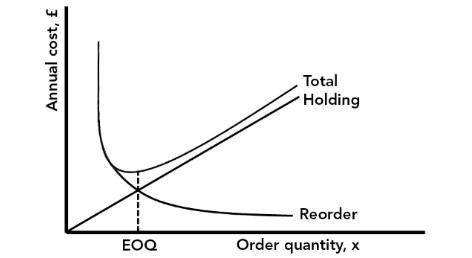 The total of annual property and re-lodge costs first decreases, then increases. The point at which cost is minimised is the EOQ. This cost behaviour is illustrated by the graph in Figure i.